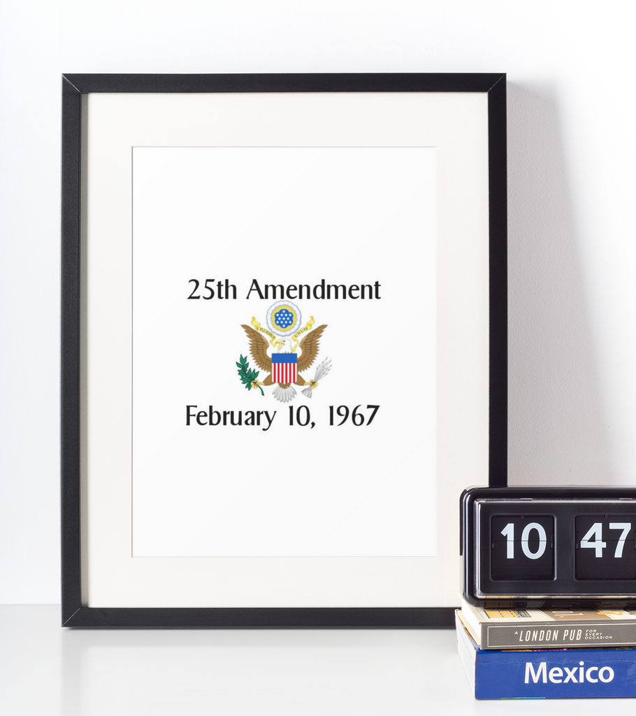 This 8x10 unframed 25th Amendment Wall Art Print features the official ratification date (February 10, 1967) alongside the Great Seal of the United States in a clean, minimalist design. Whether you're a government teacher, law student, history buff, or political enthusiast, this print is a conversation starter and a classy nod to our constitutional past.