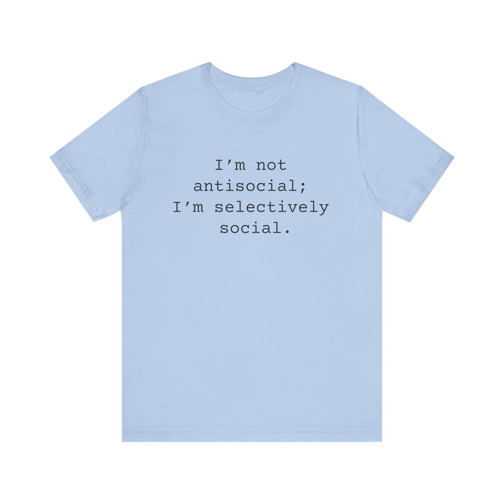 I'm not antisocial; I'm selectively social - Great comfy tee for those trying very hard to keep their mouths shut when having their space invaded by pushy people. Keep your sanity by telling everyone what you think without saying a word. Great gift for a bestie or coworker too.Â