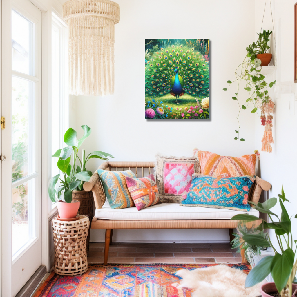 This peacock wall art is printed on 100% 13.5 ML thick canvas (thickness for added protection) and wrapped around a wooden frame. The back is covered, which adds even more protection for your print, as well as strength. It comes with hanging hardware attached.Â