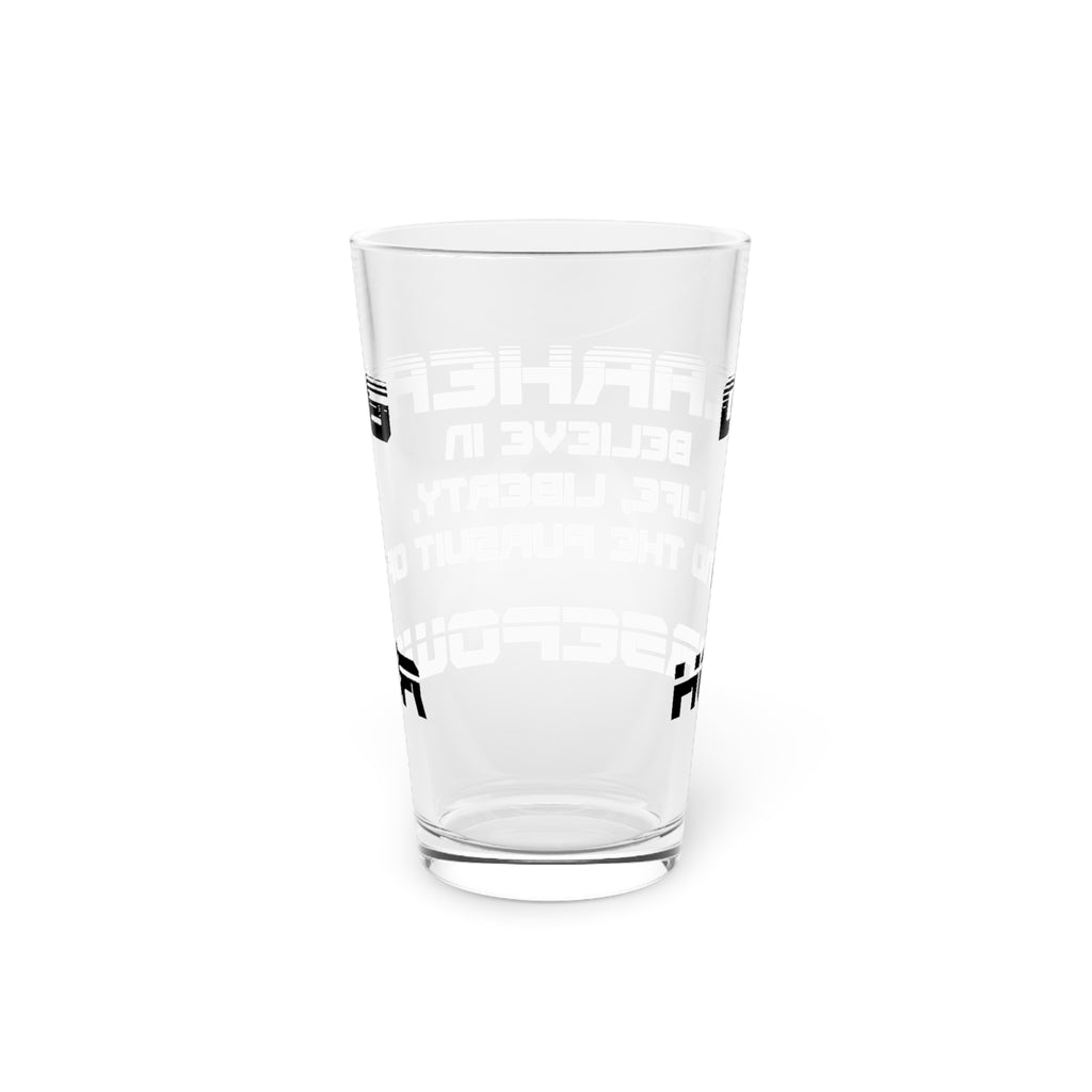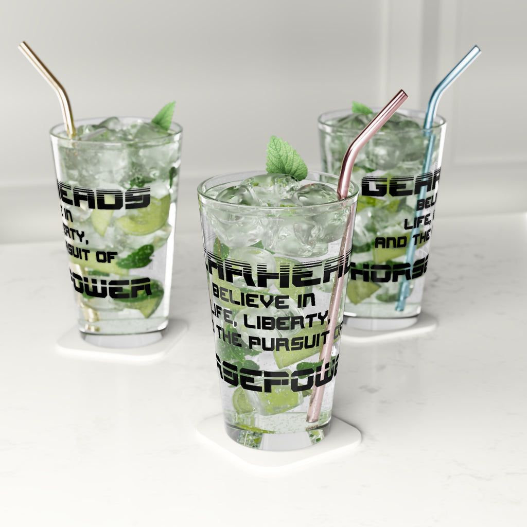 This isn't just a pint glass—it's a symbol of the relentless quest for power that roars within every car enthusiast's heart. Crafted from crystal-clear glass, it holds 16 ounces of your chosen brew, promising not just a drink, but a story with every gulp.