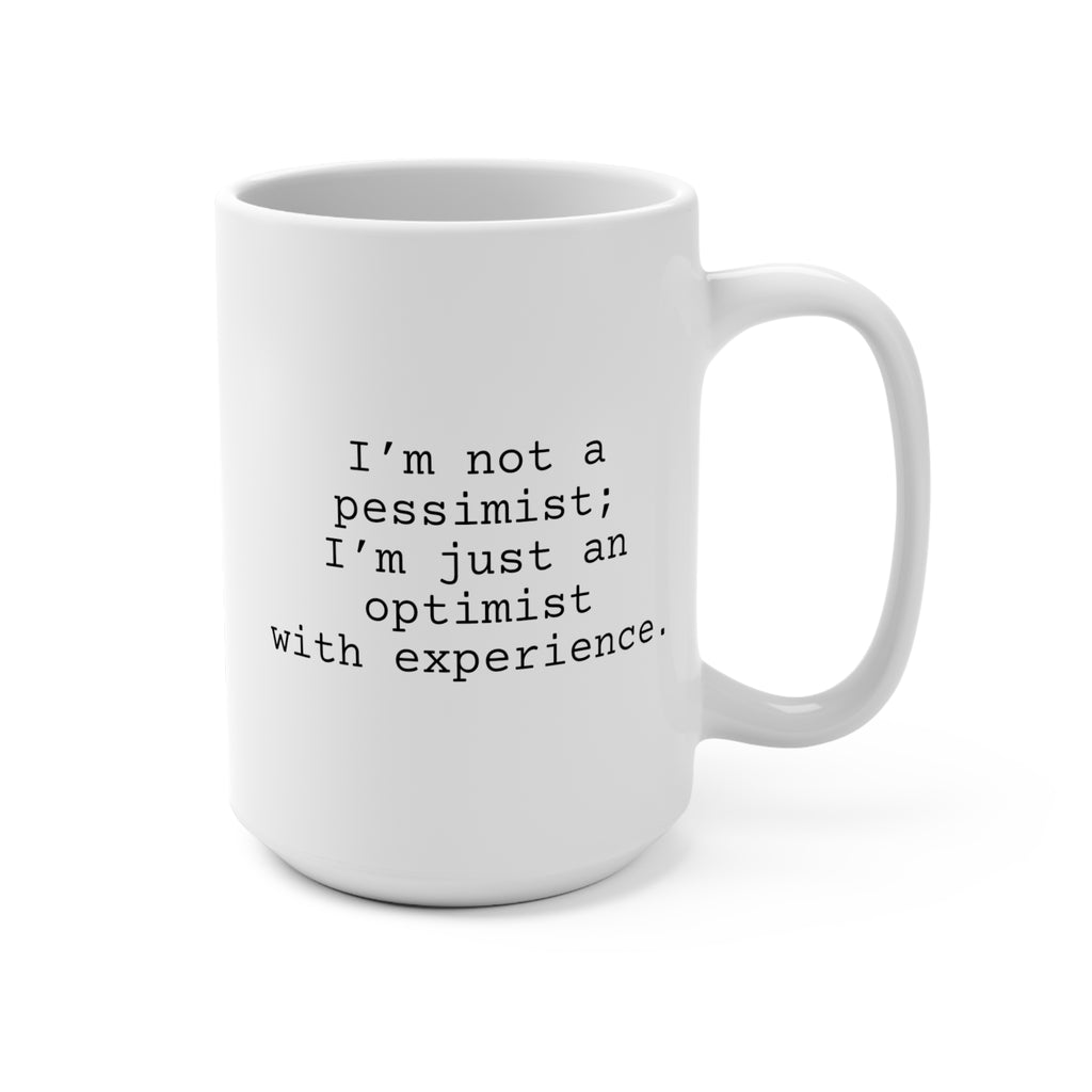Not a pessimist, just an experienced optimist. Life isn't all smooth sailing and positivity, but we've been there before. Show off your not-always-negative attitude with this 15oz, high-quality, white ceramic mug perfect for coffee or tea lovers.