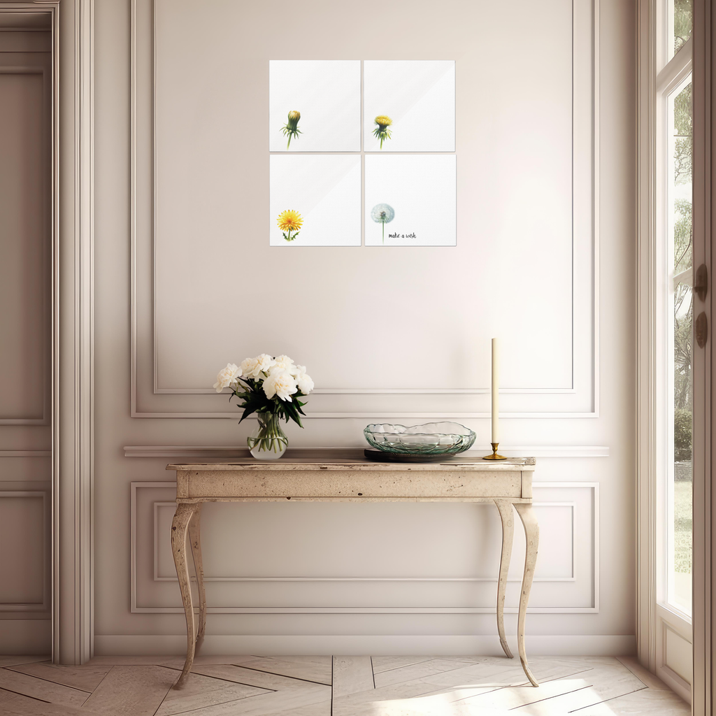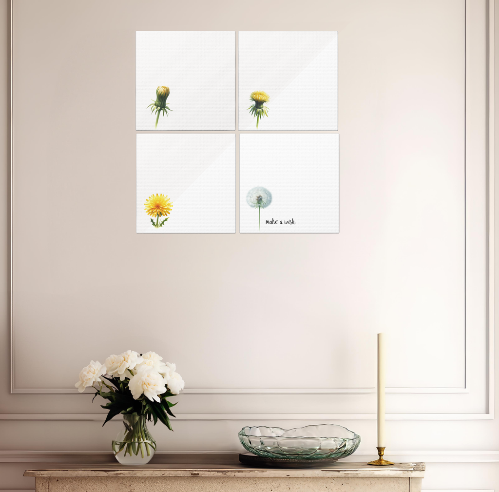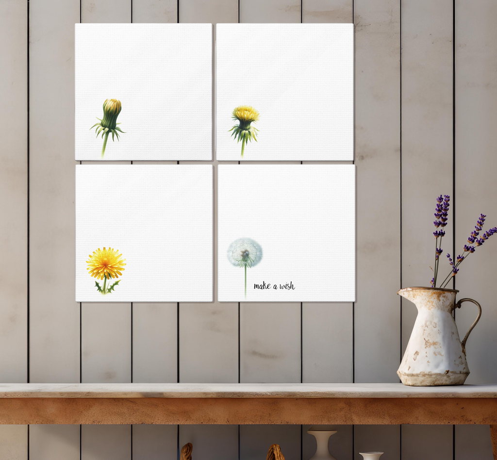 For the person who loves flowers but believes that less is more. Each panel features a watercolor style dandelion in stages of its life. The final panel reminds us of our childhood when we made a wish and blew away the seeds from the fuzzy top.Â