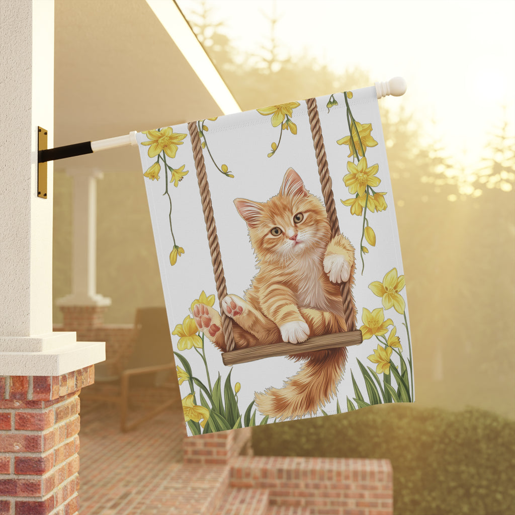 Orange Kitten on Swing Garden Flag & Porch Banner Spring Floral Decor